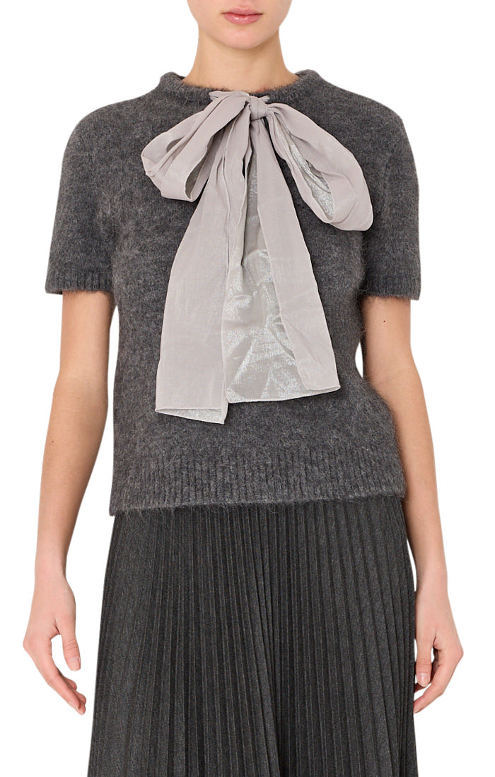 This cozy short-sleeve sweater is finished with a statement satin bow at the neckline. Pair it with a sleek trouser for an elevated desk-to-dinner look, or style it with denim for an effortlessly chic weekend outfit.