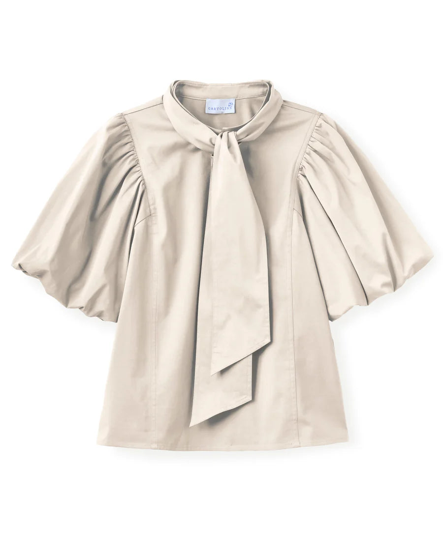 Bringing an architectural edge to a foundational summer color, playful volume and delicate neckline details shine here. It is an effortless choice for elevating simple trousers or flowing maxi skirts.