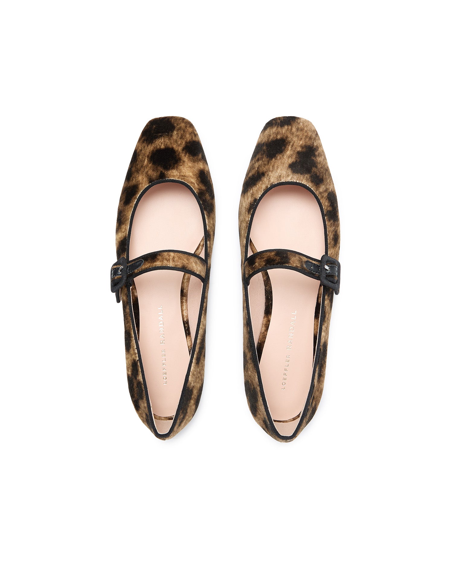 Mary Jane flat in leopard Italian velvet with delicate black piping. Features a padded leather footbed with gold stamped logo, a square toe, and an adjustable bridge strap with buckle closure.