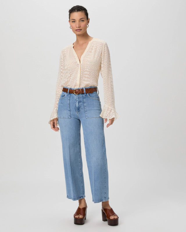 This modern ultra high-waisted wide leg has a slightly relaxed fit and an ankle length silhouette. This pair is crafted from our PAIGE VINTAGE denim in a faded medium blue wash with inset patch pockets, copper hardware, and a raw hem. PAIGE VINTAGE takes all of the work out of breaking in your favorite pair of vintage jeans. We've combined the comfort of stretch with everything you love about rigid vintage denim to create super soft jeans that feel perfectly lived-in from the very first wear.