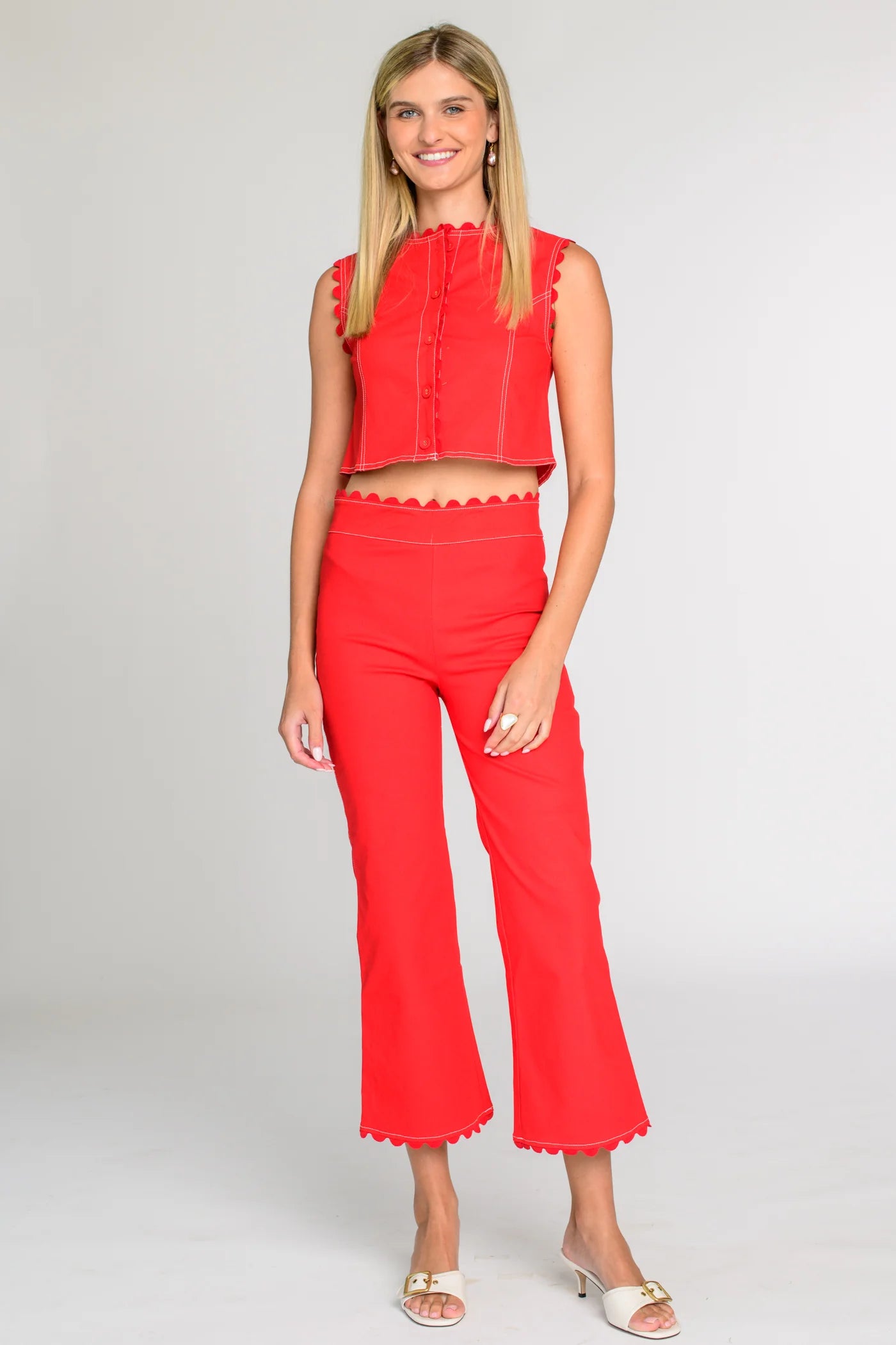Our Jojo pants in Poppy Red are a darling pant with a tailored silhouette and whimsical touches. We love her ric rac trim and back heart appliqué detail. This stretch twill fabric is lightweight, perfect for warm days that turn into breezy evenings.