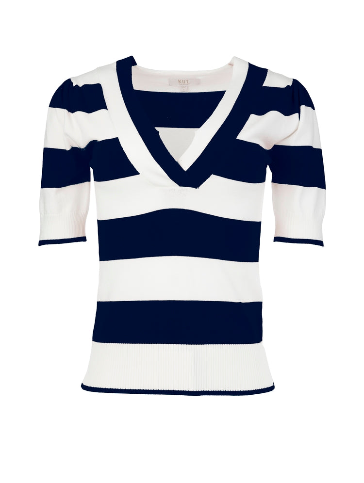 Kut From the Kloth - Yona Striped V-Neck Short Sleeve Sweater - White/Navy