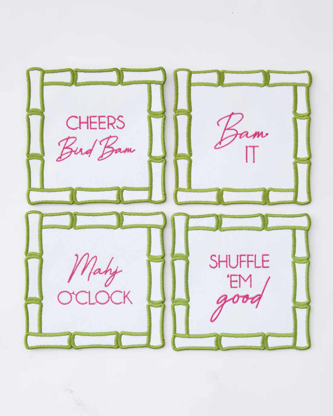 Presenting our Bamboo Mahjong Cocktail Napkins, a collection of four intricately embroidered napkins designed to elevate your Mahjong gatherings. These complement our Bamboo cocktail markers, offering the ideal complement to your Mahjong hosting needs.