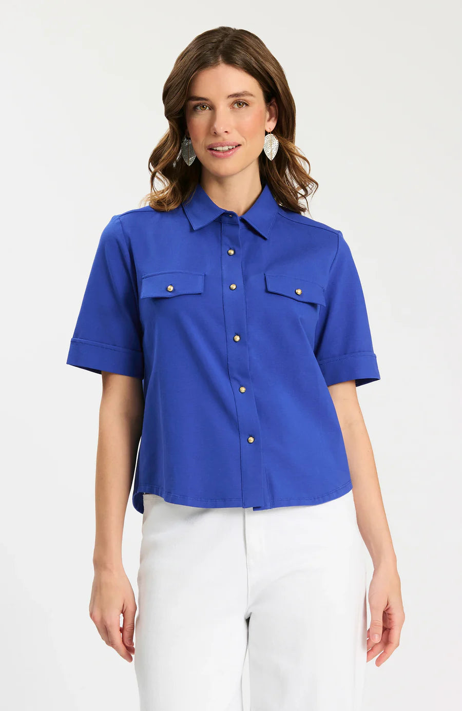 A modern classic you’ll reach for again and again. This short-sleeve button-down is tailored yet effortless, crafted in a comfortable cotton-spandex blend. Chest pockets and gold-tone buttons add a polished finish, while the relaxed silhouette keeps it easy to wear. Perfect for work, weekends, or travel—tucked, untucked, or layered under your favorite jacket.